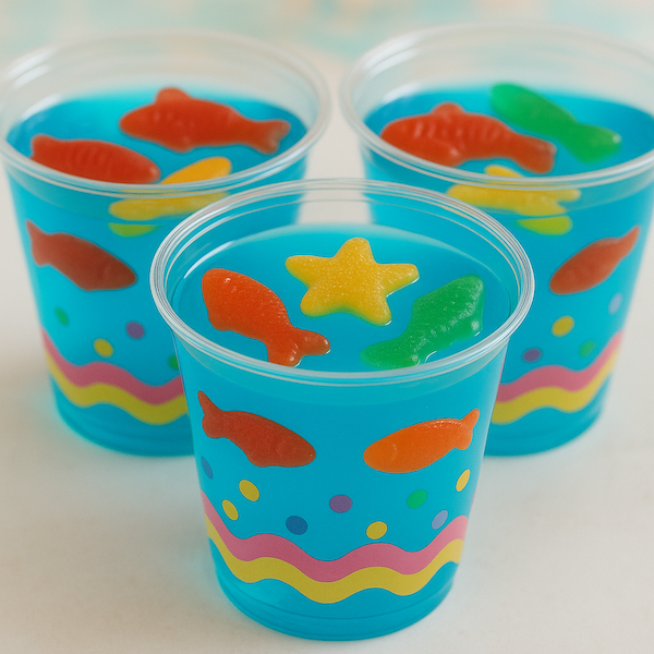 - Gelatinas del océano: Gelatinas azules con gomitas en forma de peces o estrellas.