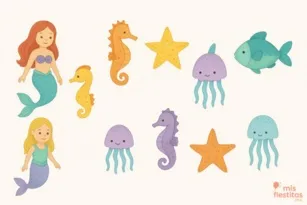 - Sirenas y criaturas del mar: Decora con figuras de sirenas, caballitos de mar, estrellas marinas, peces y medusas colgantes hechas con papel o tela.
