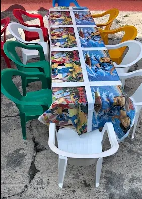 10 sillas de plástico para niños, combinadas con mantelería temática para dar color y coherencia, desde colores básicos hasta personajes de moda.