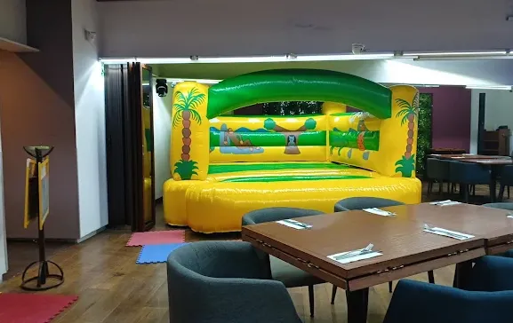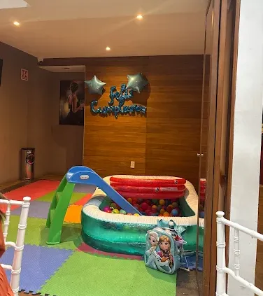 Área infantil: Espacio con inflables, resbaladillas, alberca de pelotas y consolas de videojuegos; hay menú para niños.