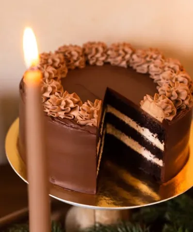 Bizcocho profundo con relleno y cobertura de chocolate belga, textura suave y rica. Disponible en rebanada o pastel entero.