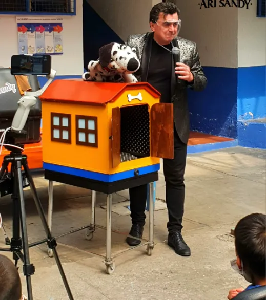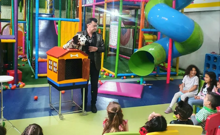 Incluye ventriloquía con un dálmata de peluche que, tras una ilusión, se transforma en uno real que los niños podrán acariciar. -