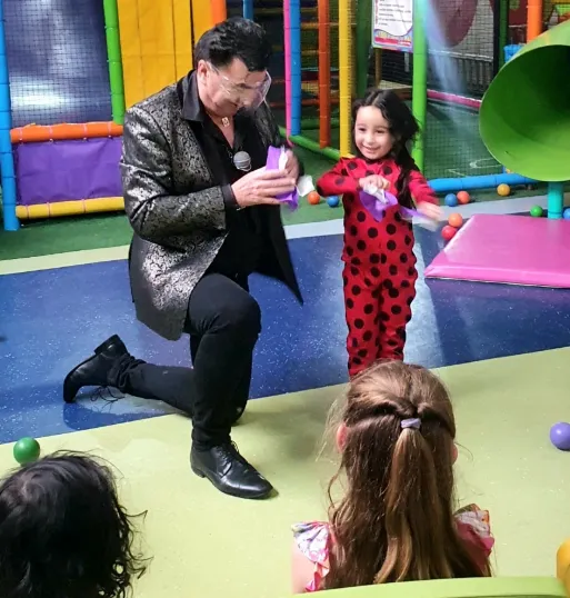 Magia cómica con animación infantil: aparición de pequeños animales como conejos o hurones, disfraces simpáticos para los niños y trucos participativos como la suspensión del festejado. -