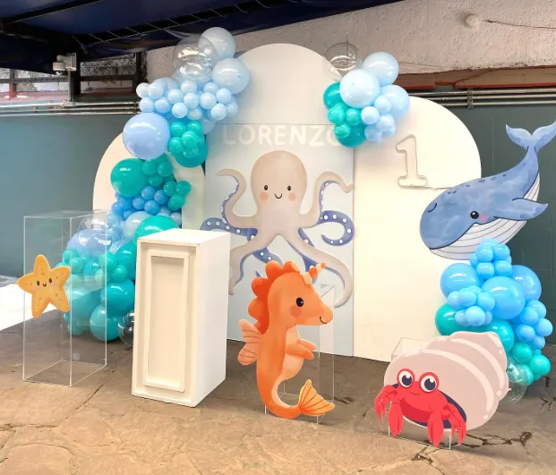 Decoración con globos biodegradables (látex) diseñados especialmente para celebraciones infantiles.