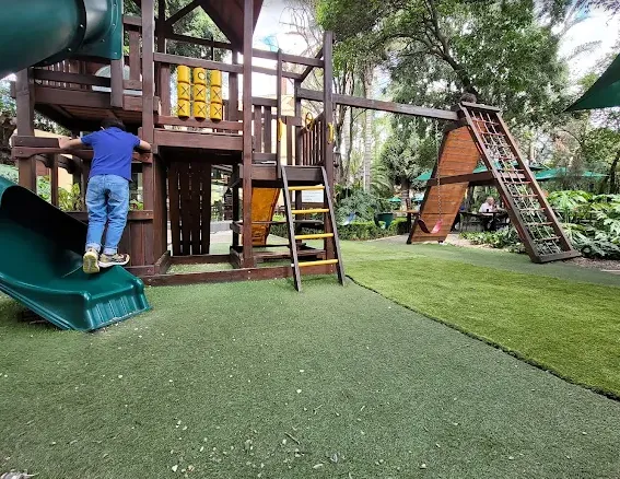 Esta sucursal cuenta con área de juegos para niños, ideal para que los pequeños se entretengan mientras los adultos disfrutan tranquilamente de su comida.