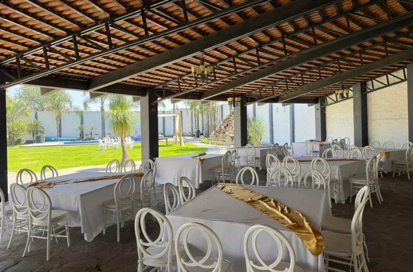 Terraza / Salón: Área techada y equipada para el banquete y la recepción principal.