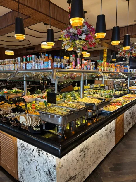 Barra de ensaladas: Barra muy variada con ensaladas frías y calientes, sopas, guisados, pastas y más.