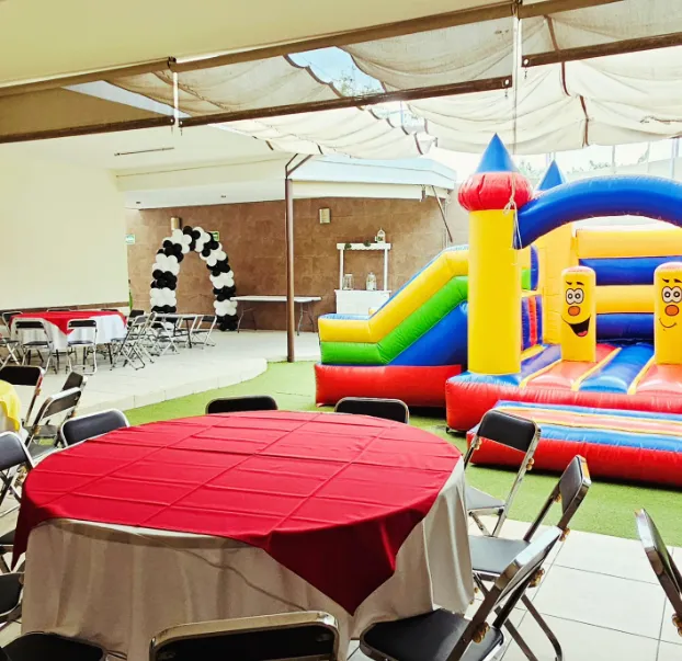 Incluye “mobiliario hasta 100 invitados” (mesas/sillas), arco de globos, brincolín, bocina con Bluetooth, una hora previa de montaje.