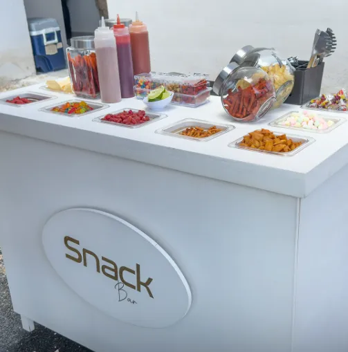 🍬 Snack Bar: una barra de snacks iluminada con más de 40 opciones de botanas y dulces, lista para consumo libre durante el tiempo contratado (generalmente 2 horas), con chamoy, salsa botanera, tajín y limones para darle un toque especial.