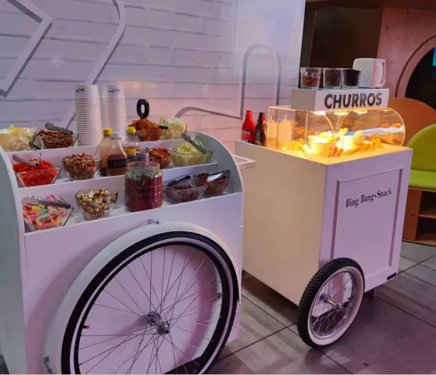 Flexibilidad: puedes combinar carritos de snacks con candy bar, mixología, etc., lo que permite ajustar la oferta al evento.