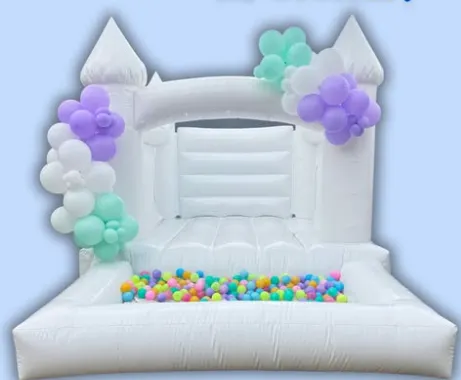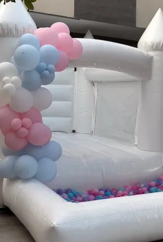 Castillo blanco inflable, ideal para sesiones de fotos, bautizos, bodas y eventos con decoración elegante o temática minimalista.