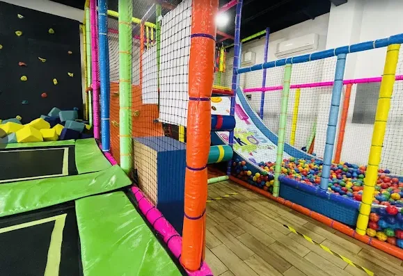 Área de juegos infantiles con resbaladillas, inflables y espacios interactivos.