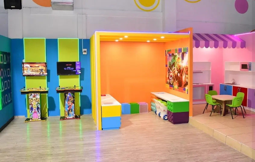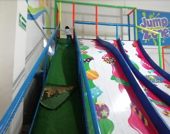 Área de juegos con resbaladillas, inflables y módulos interactivos.
