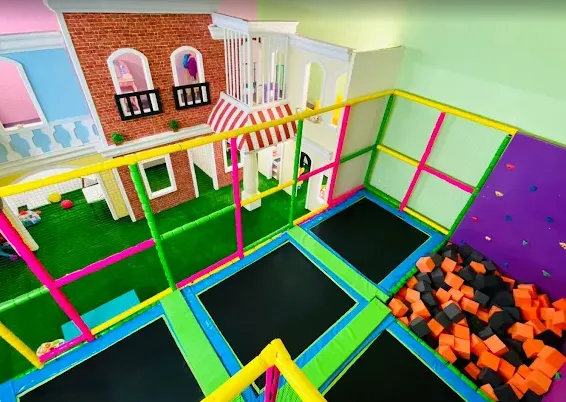 Salón Caracol: con área gamer, futbolito, casitas temáticas (mini supermercado, salón de arte, casita Lego, boutique y pasarela), trampolines y babygym.