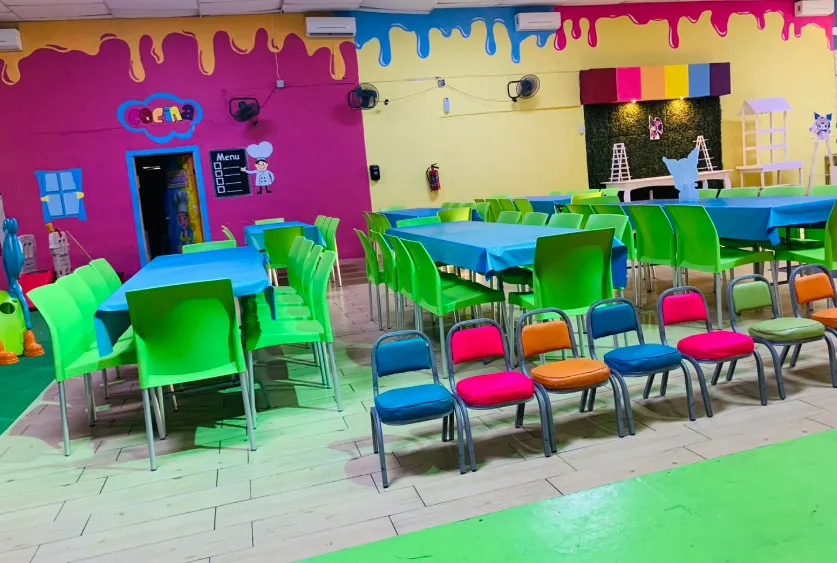 Decoración llamativa y temática, con un entorno colorido que despierta la fantasía infantil.