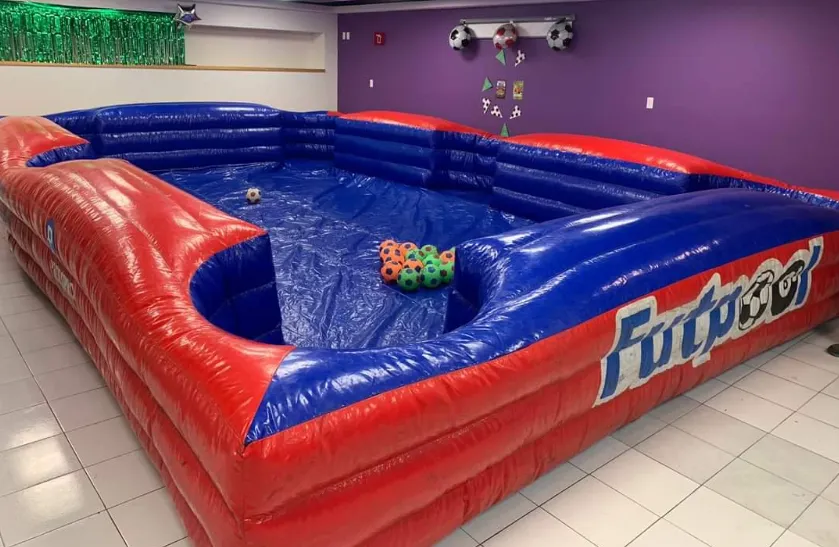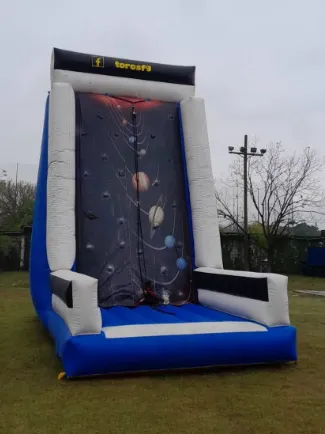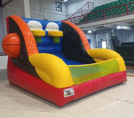Colchón o inflable alrededor para amortiguar caídas, superficie plana para montaje seguro.